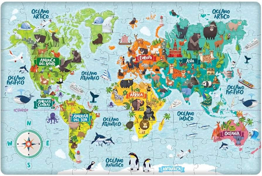 Diviértete y aprende armando este rompecabezas gigante. Sus piezas en forma de continentes, te servirán de guía para armarlo y cada continente tiene ilustraciones súper originales alusivas a cada uno de los países que lo conforman.