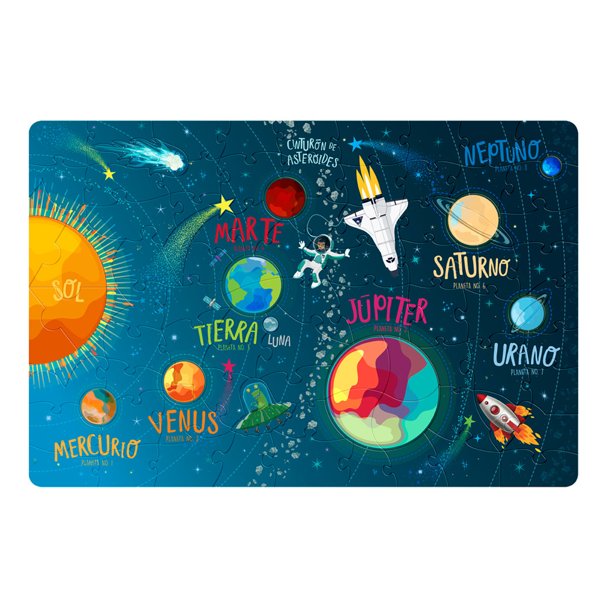 Diviértete y aprende armando este rompecabezas gigante. Sus piezas en forma de los planetas, te servirán de guía para armarlo y cada entidad tiene ilustraciones alusivas a cada uno de los países que lo conforman.